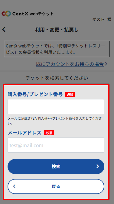 クレジットカードを選択した場合は、特別車チケットレスサービスで登録されているクレジットカード情報を使用します。