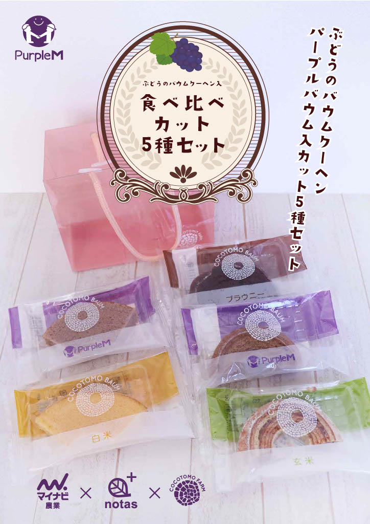 定番の白米、玄米、ブラウニーに加えてぶどうのバウムクーヘンのパープルバウムも入ったセット♪