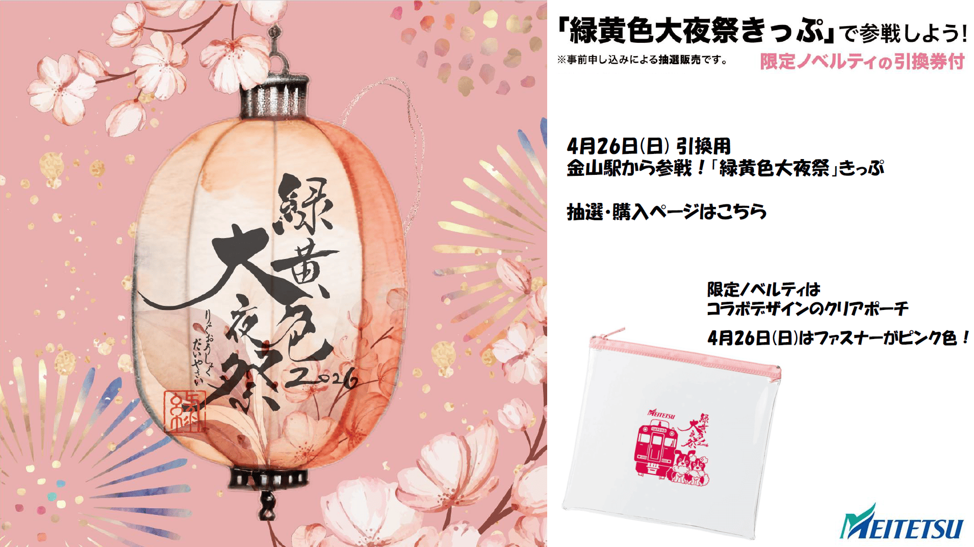 このページは、4月26日(日)引換用の『金山駅から参戦!「緑黄色大夜祭」きっぷ』の「抽選応募」および、当選後の「購入手続き」を行う専用ページです。